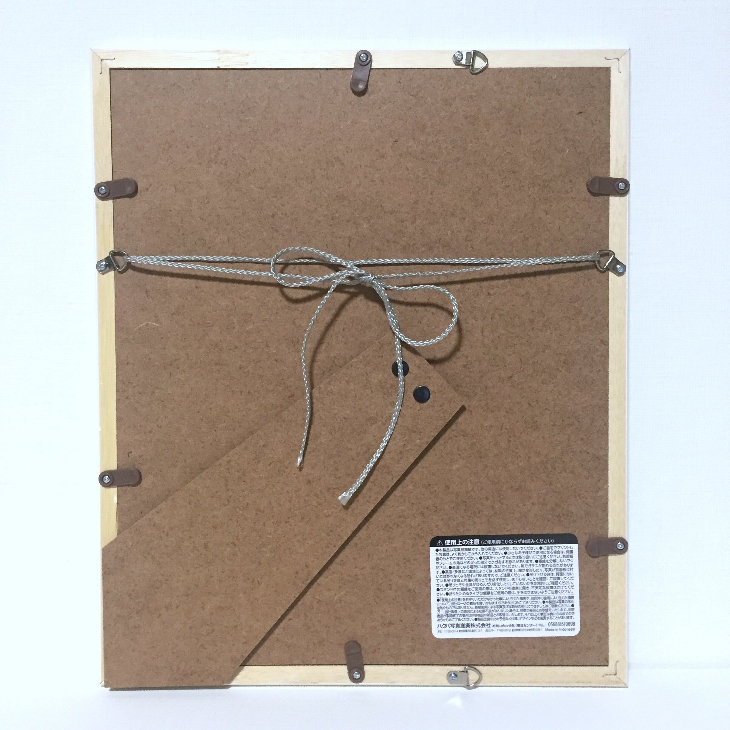 フレームは壁掛けにも、そのまま立てて写真立てのようにもお使い頂けます。ご自分で額をお選びになる際には、下記のマット中抜き寸法を参考にお選び下さい。余白は約上下左右5mmとなっております。