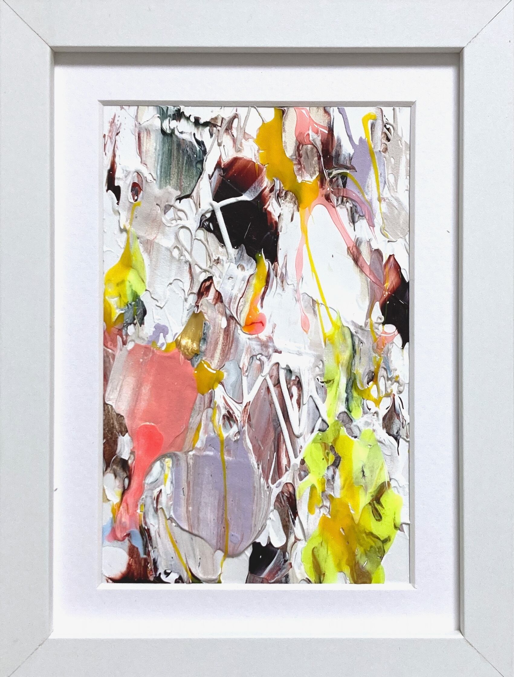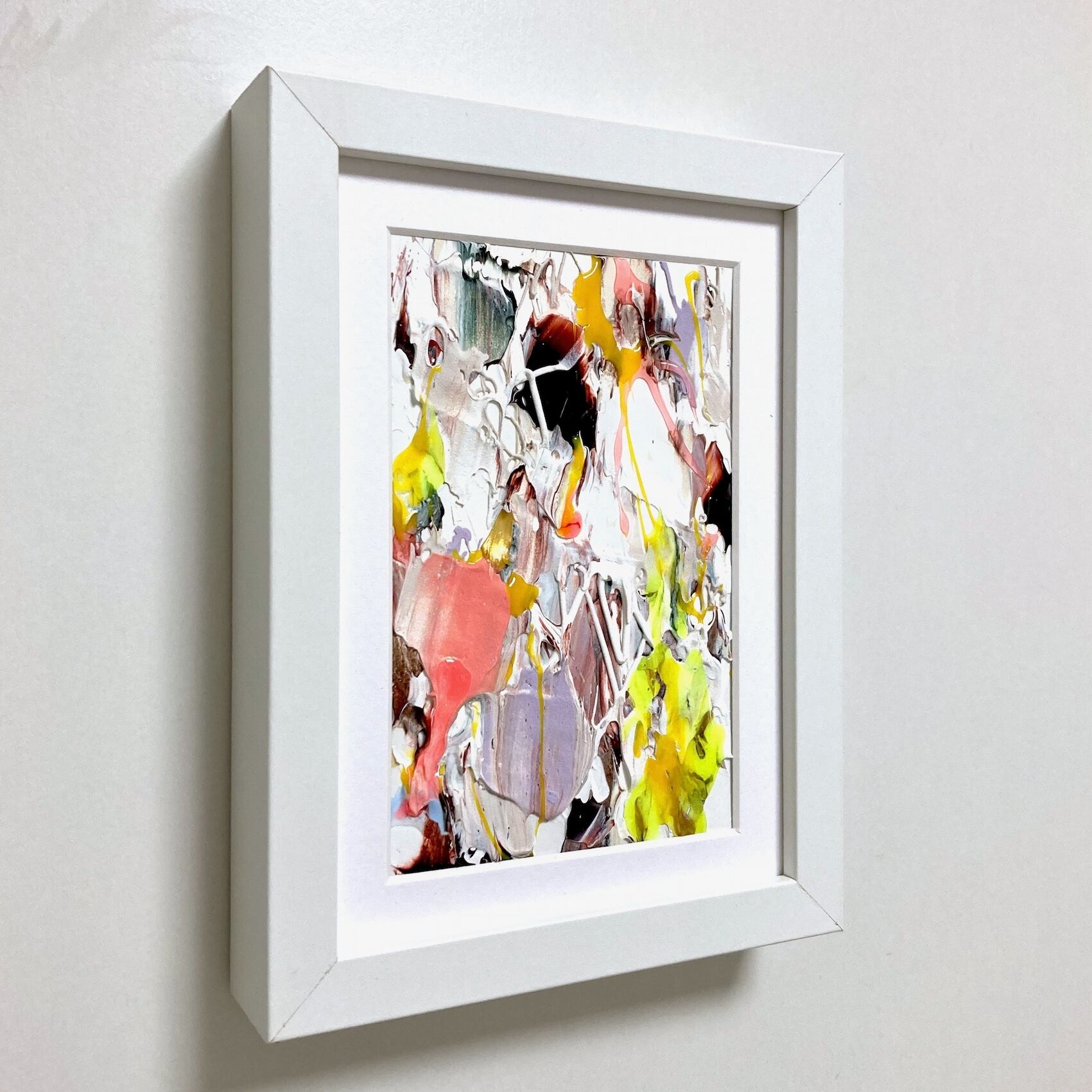 ⚫︎撮影時反射を防ぐためアクリル板を抜いて撮影しておりますが、実際はアクリル板が入ります。尚、作品の絵の具の厚みによってアクリル板の位置が変えられる仕様の額縁となっており、絵の具の厚みのあるものはアクリル板から約1cmほど下がった位置に絵が入ります。作品ごとに異なりますので、複数購入の際などは画面上でお確かめの上ご購入くださいませ。