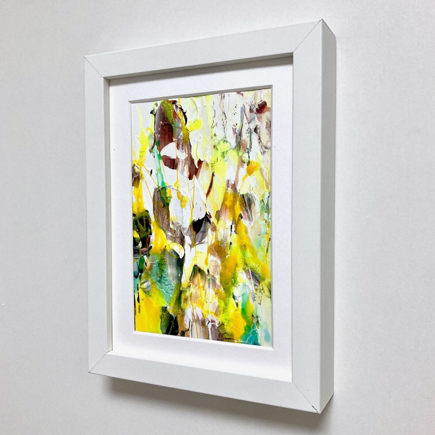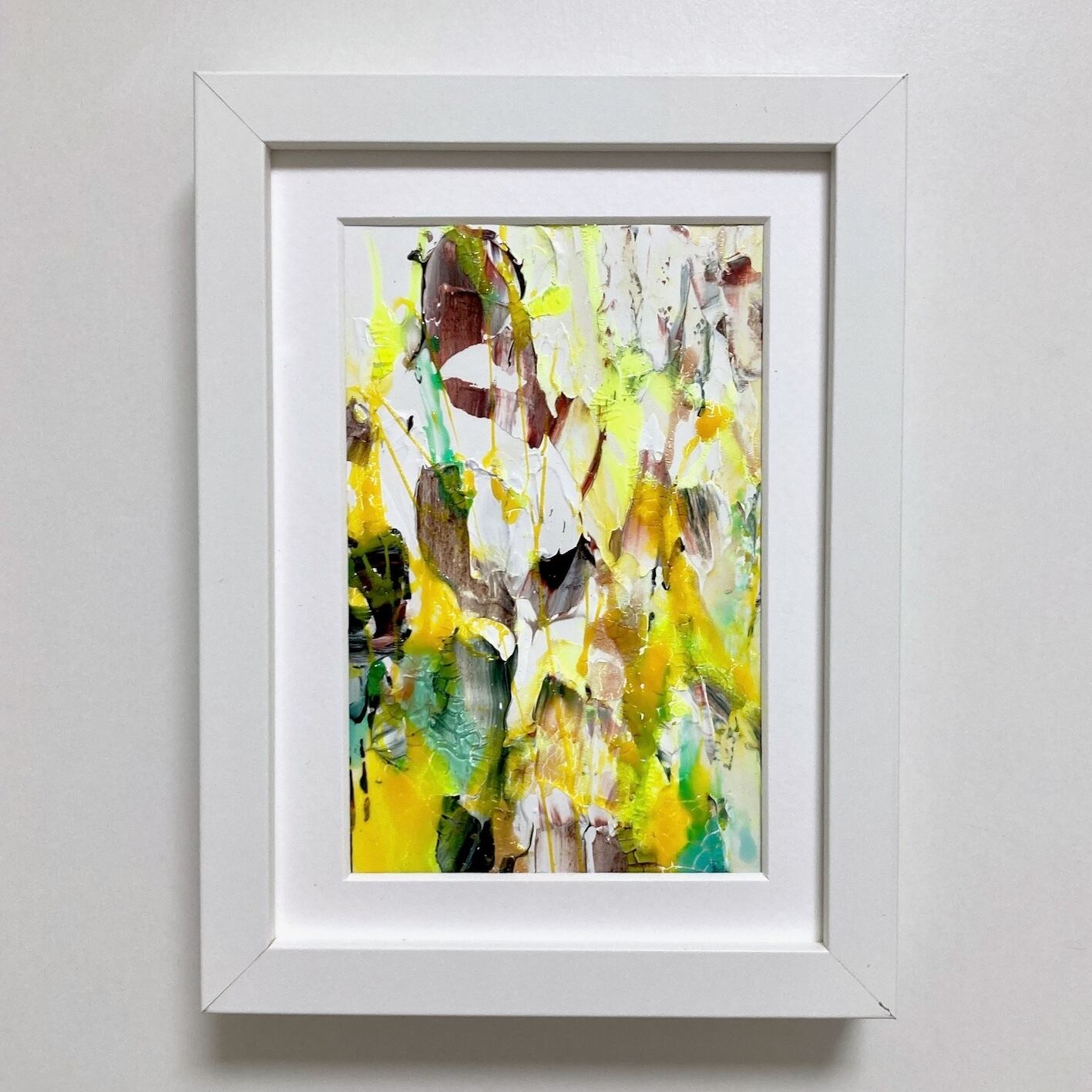 ⚫︎撮影時反射を防ぐためアクリル板を抜いて撮影しておりますが、実際はアクリル板が入ります。尚、作品の絵の具の厚みによってアクリル板の位置が変えられる仕様の額縁となっており、絵の具の厚みのあるものはアクリル板から約1cmほど下がった位置に絵が入ります。作品ごとに異なりますので、複数購入の際などは画面上でお確かめの上ご購入くださいませ。