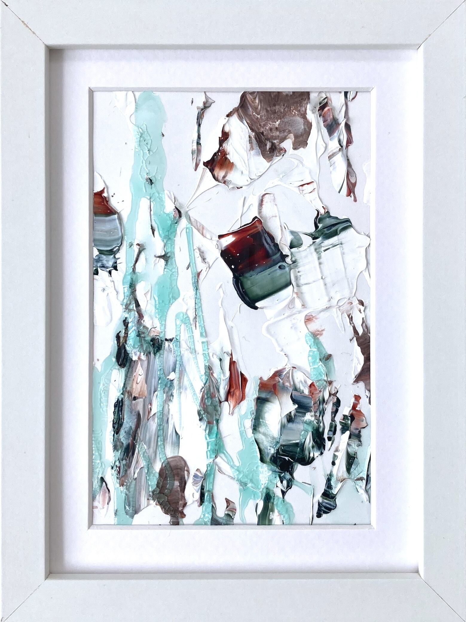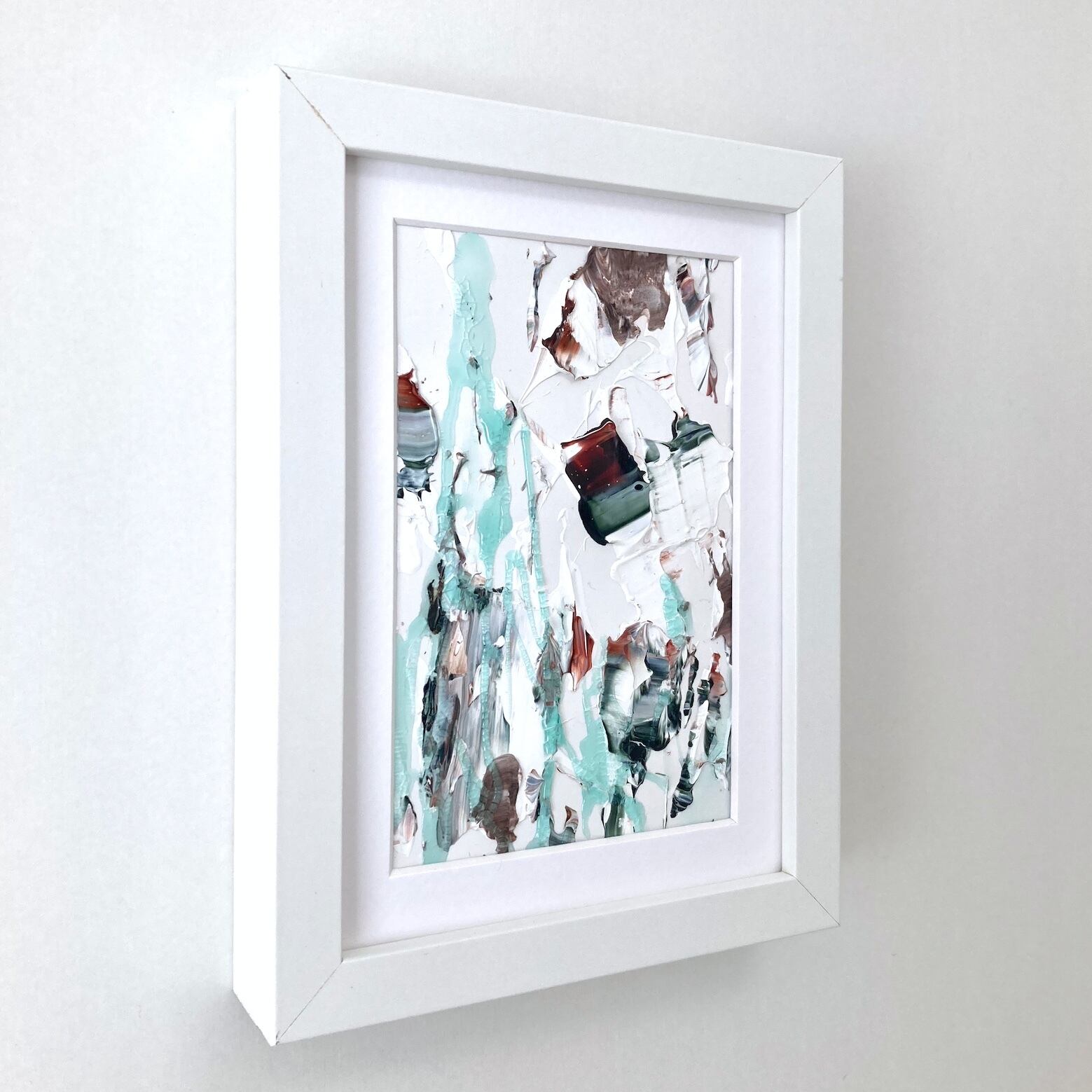 ⚫︎撮影時反射を防ぐためアクリル板を抜いて撮影しておりますが、実際はアクリル板が入ります。尚、作品の絵の具の厚みによってアクリル板の位置が変えられる仕様の額縁となっており、絵の具の厚みのあるものはアクリル板から約1cmほど下がった位置に絵が入ります。作品ごとに異なりますので、複数購入の際などは画面上でお確かめの上ご購入くださいませ。